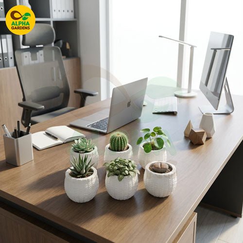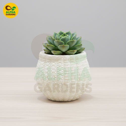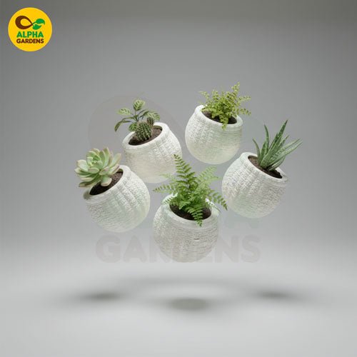 Elegant white embossed resin planter for succulents and small plants. Durable, stylish, lightweight pot perfect for home décor, office desks, and indoor greenery.