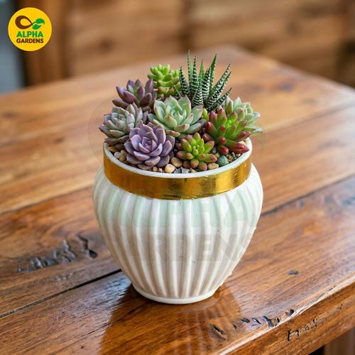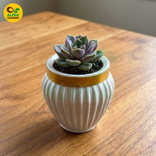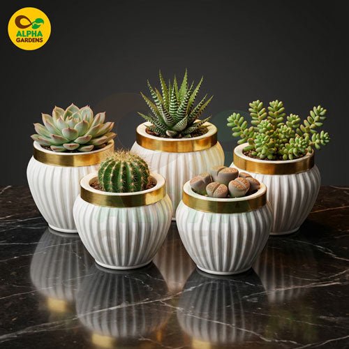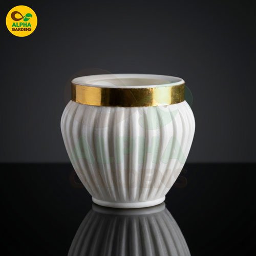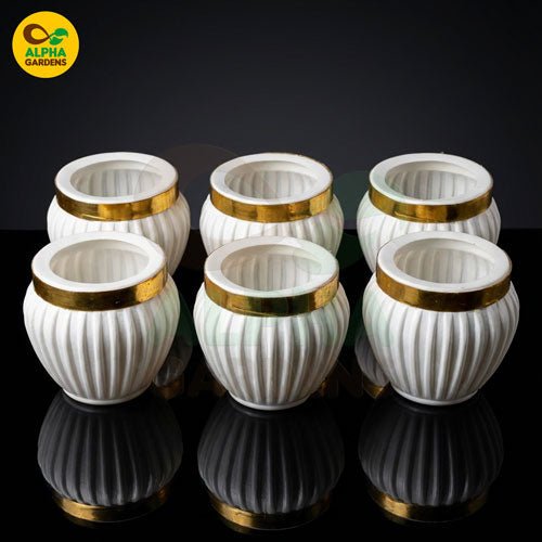 Give your indoor plants a luxurious home with these White & Gold Premium Mini Plastic Pots — designed to bring modern elegance and long-lasting durability to your space. Their ribbed texture, glossy finish, and metallic gold rim make them stand out as a stunning décor piece for any room. Perfect for succulents, cacti, lithops, and small indoor plants, these pots offer a beautiful blend of style and practicality.